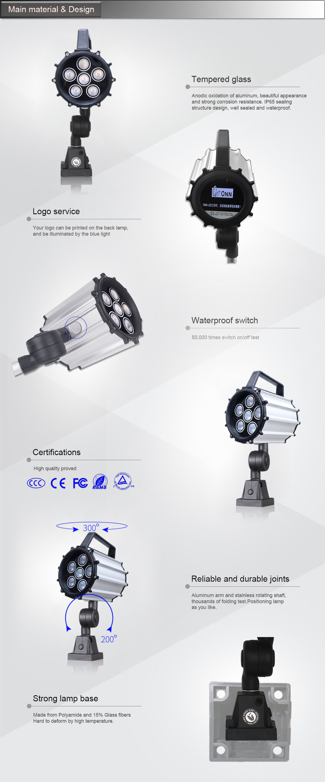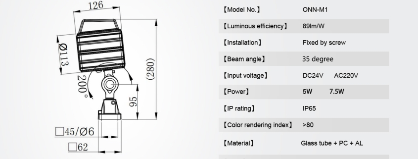 All ONN LED Machine Light are marked by their premium quality materials and robust construction. These qualities are particularly apparent in the M1. Installed on a practical pivoting-head, these characteristics guarantee a solid machine luminaire with flexible reliability and a long life.
